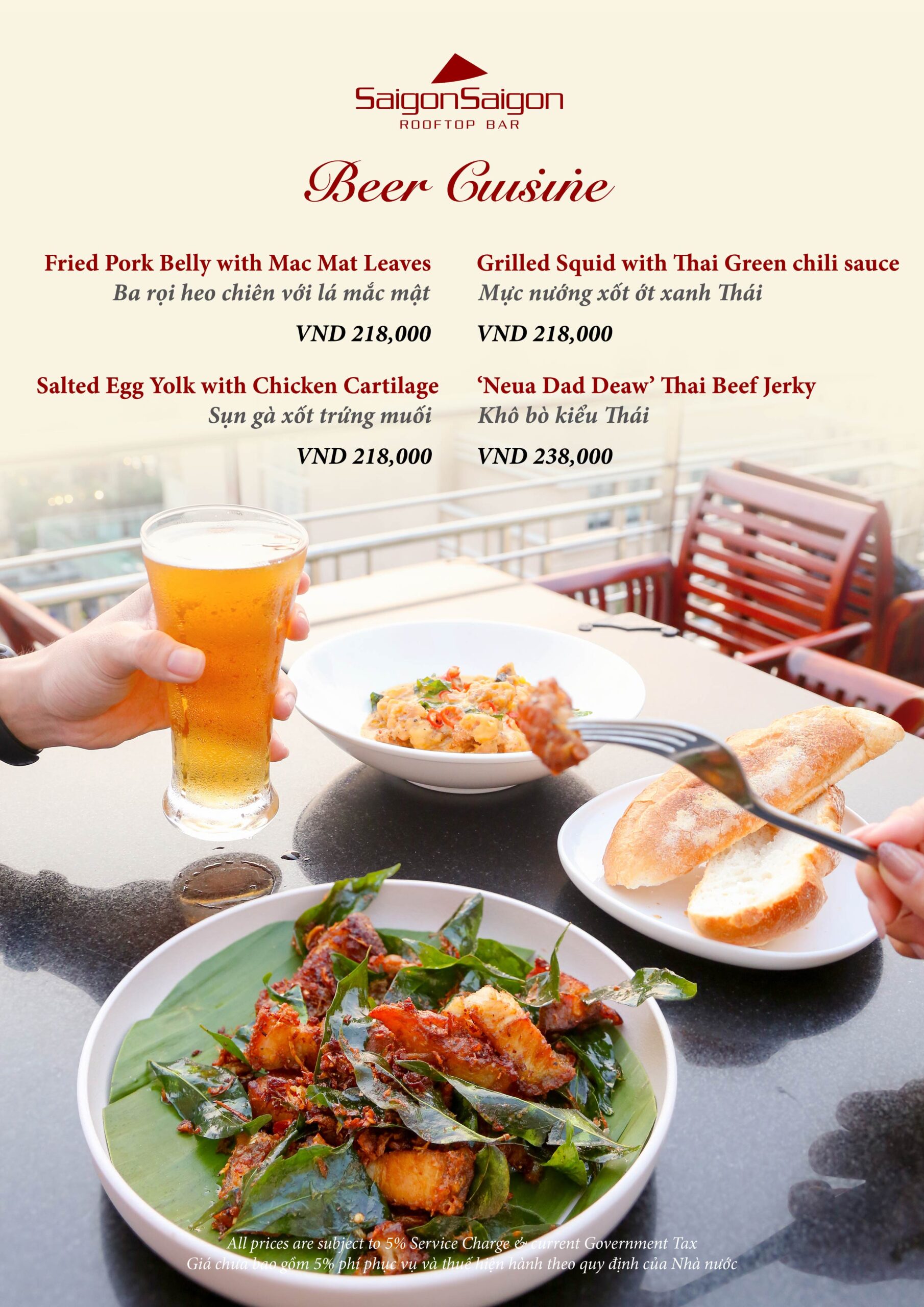 Thực đơn Beer Cuisine là sự giao thoa hài hòa giữa hương vị địa phương và phong cách gastropub hiện đại, với những điểm nhấn hấp dẫn như ba chỉ heo chiên lá mắc mật, sụn gà sốt trứng muối dùng kèm bánh mì baguette, mực nướng sốt ớt xanh Thái, và bò khô Thái phong cách Neua Dad Deaw. Mỗi món ăn được chăm chút để tôn trọn hương vị của thức uống bạn lựa chọn.