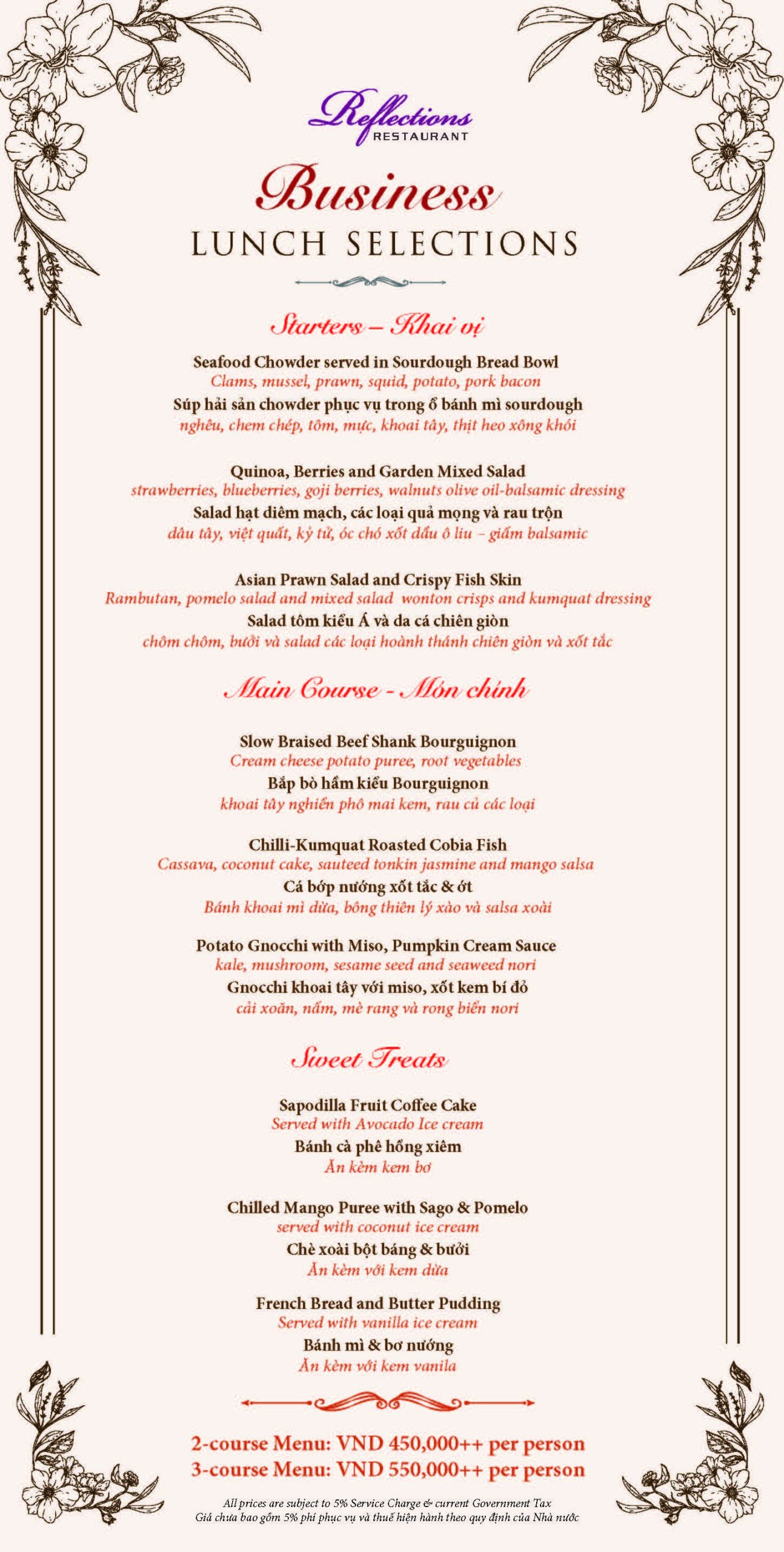 Nhà hàng Reflections mời bạn thưởng thức thực đơn trưa mới của chúng tôi, nơi hương vị truyền thống phong phú của Việt Nam hội tụ một cách tao nhã. Bếp trưởng Điều hành của chúng tôi đã tuyển chọn từng món ăn một cách khéo léo, tạo ra sự kết hợp hài hòa nhất.